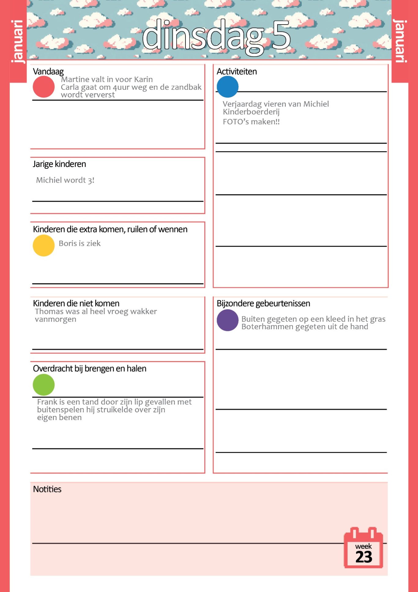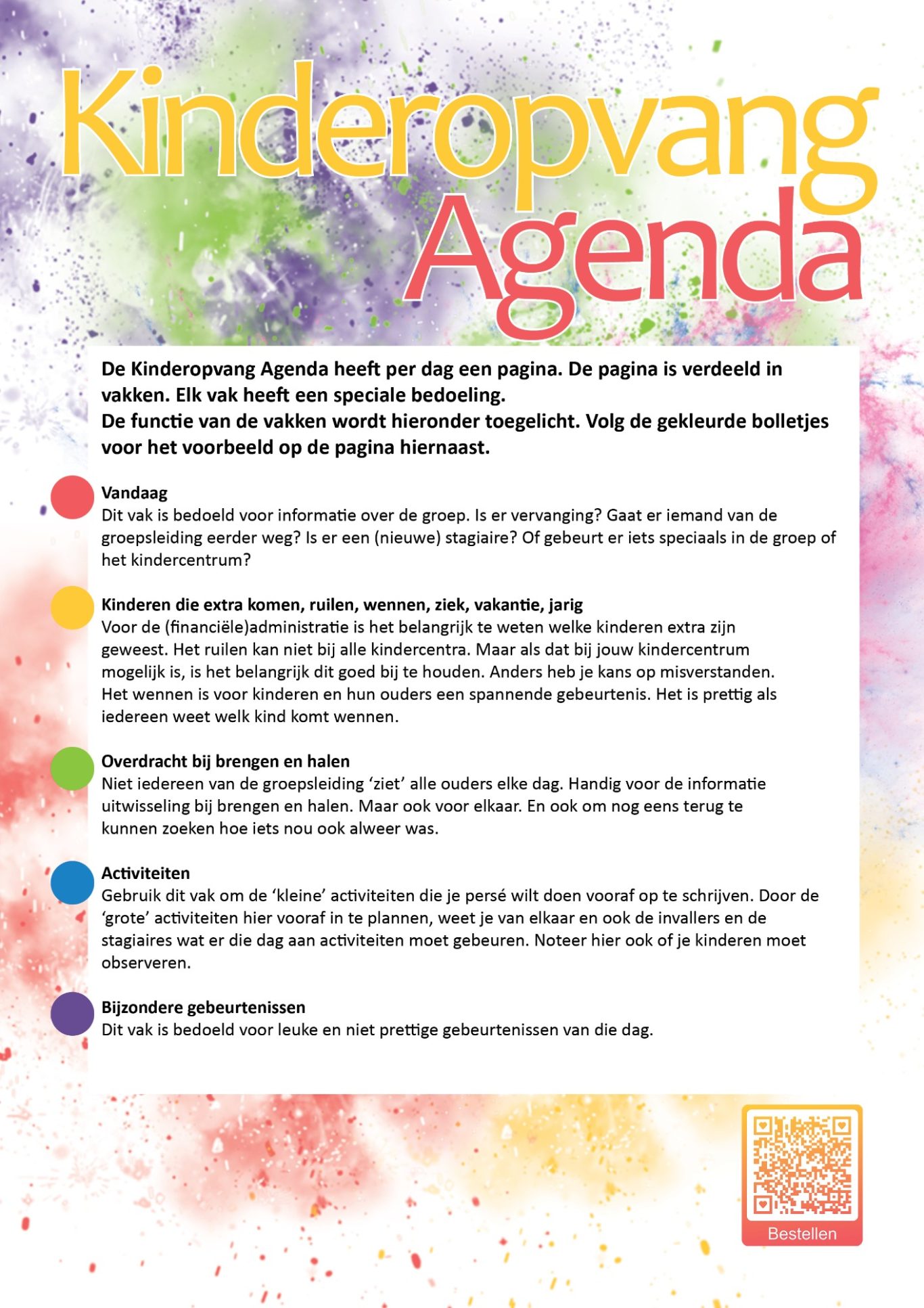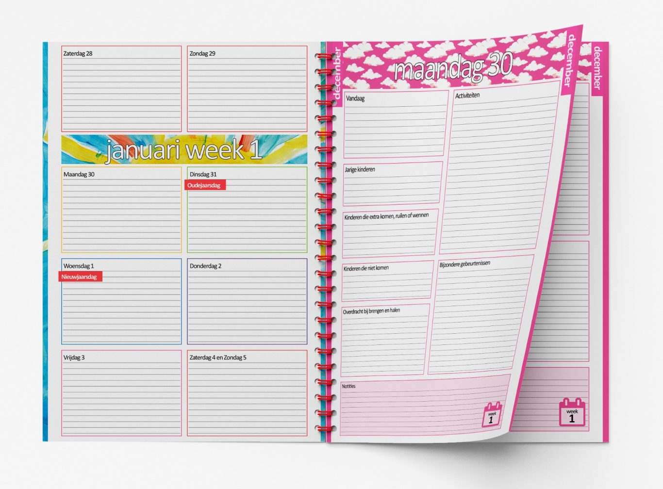 De Kinderopvang Agenda is A4 formaat en uitgevoerd in full-color, met een rode ringband. De agenda heeft een kalenderdag per pagina, zo heb je genoeg ruimte om notitities te maken en gebruik te maken van de vakken.